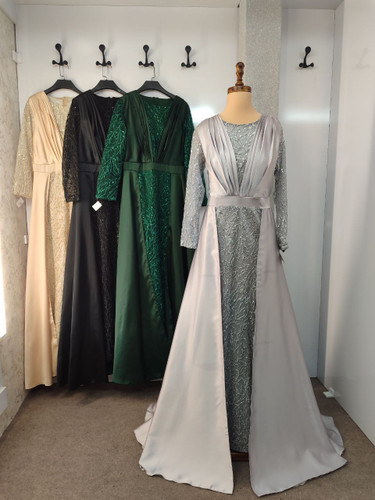 لباس مجلسی مدل سانیا — ساتن و پولک — قد کار 145 سانت — مچ آستین دکمهدار