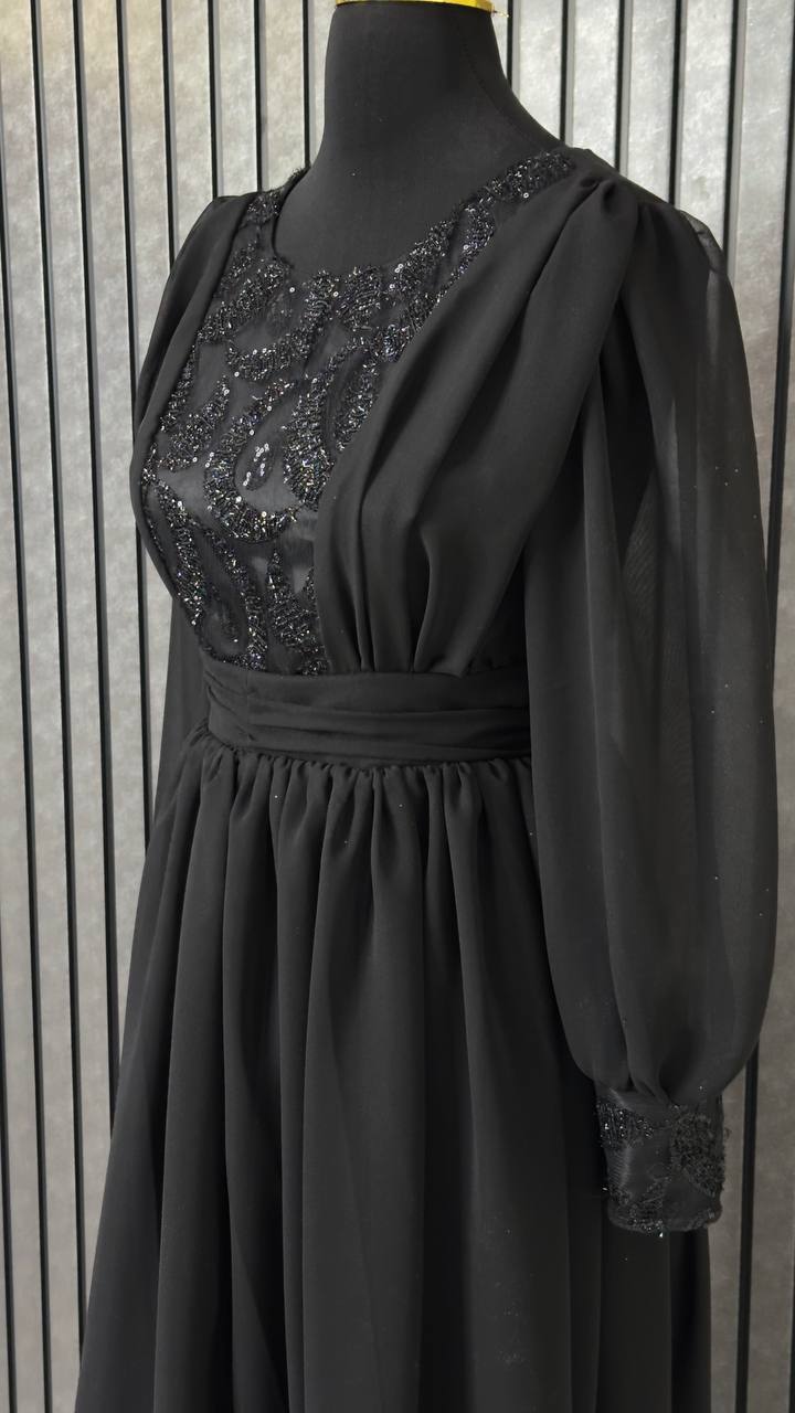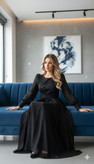 لباس مجلسی پوشیده مشکی از پارچه کرپ حریر با بالاتنه ساتن آمریکایی — ظرافتی ساده و شیک برای مراسم رسمی.