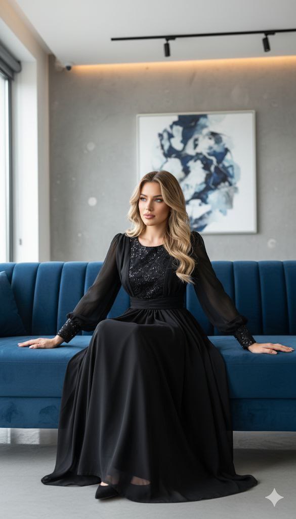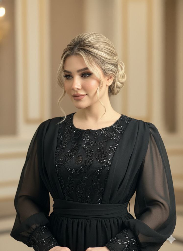 - پیراهن مجلسی پوشیده، کاملاً مشکی، تنخور آزاد-نصفهفیت؛ دامن از کرپ حریر لطیف و جریاندار دوخته شده و بالاتنه از ساتن آمریکایی براق و ساختارمند که جلوهای فاخر به استایل میبخشد. یقه بسته و آستین تا مچ/سهربع (بسته به مدل) مناسب مهمانیها، عروسیها و مراسم رسمی. آستر داخلی و زیپ مخفی پهلو برای راحتی در پوشیدن.