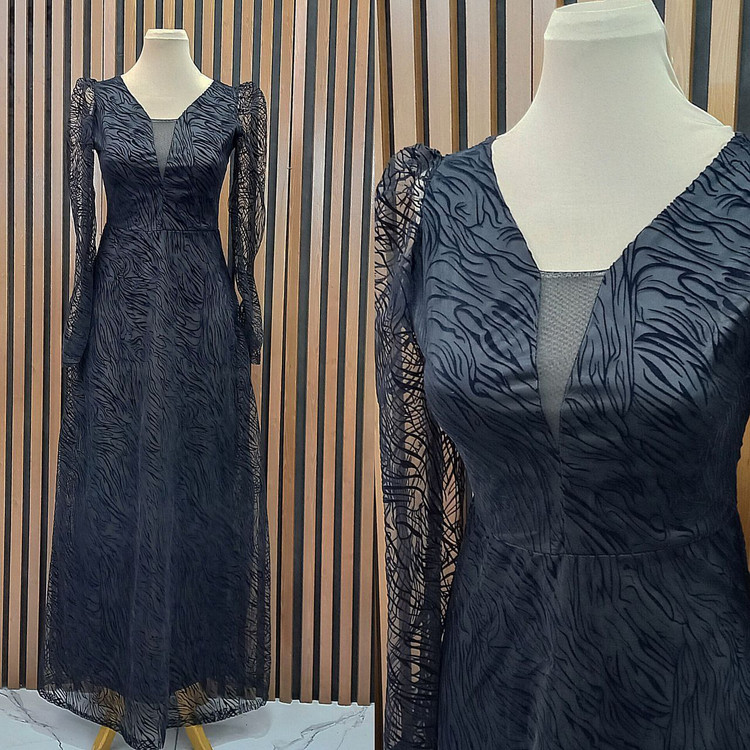 لباس مجلسی مدل «یغما» — فلوک مخمل با آستر، قد 160 سانت، زیپ پشت