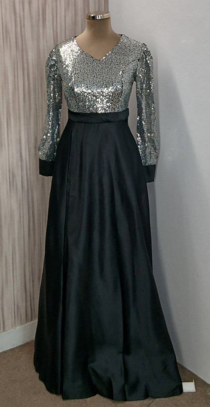لباس مجلسی مدل سانیا — ساتن و پولک — قد کار 145 سانت — مچ آستین دکمهدار
