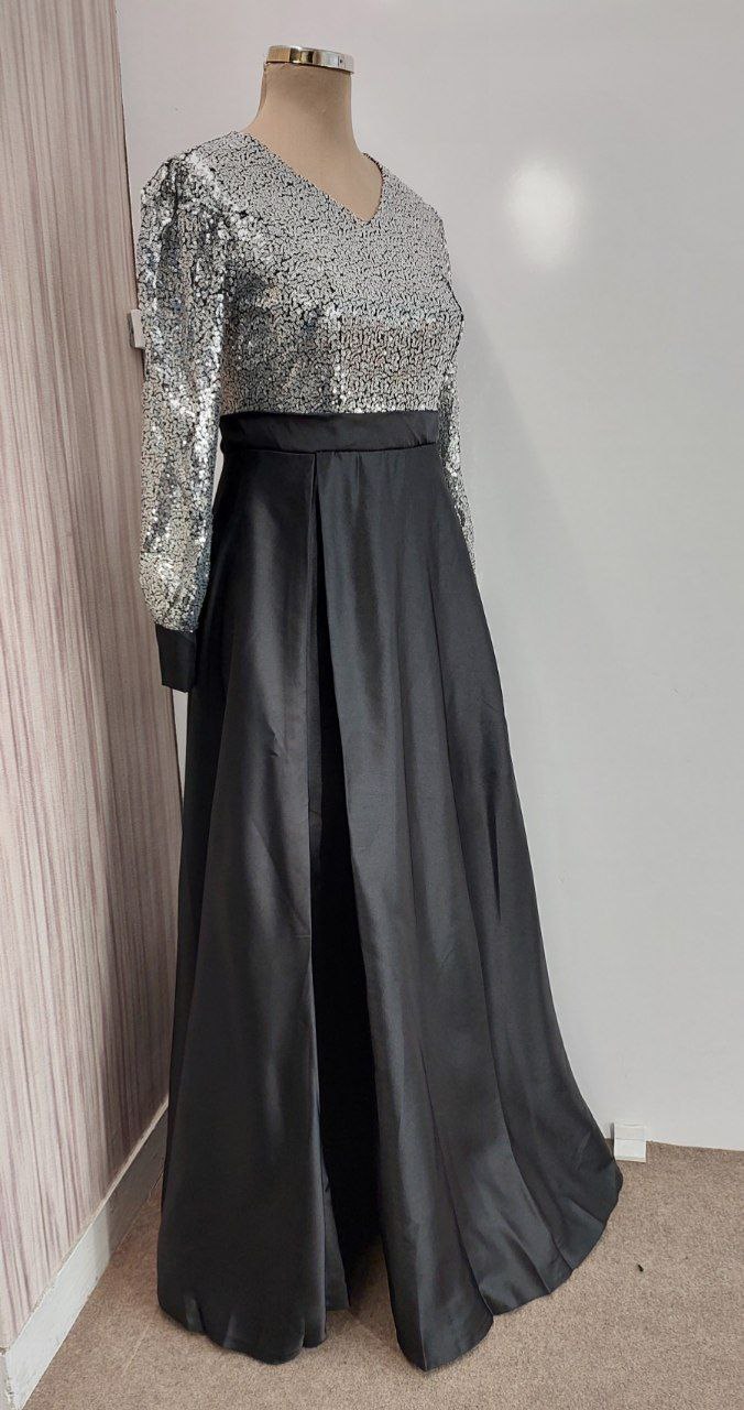 لباسی مجلسی و براق با ترکیب ساتن و پولک، مناسب مراسم و مهمانیهای شب. طراحی دارای مچ آستین با دکمه برای جلوهای کلاسیک و جزئیات زنانه. قد کار 145 سانت برای استایل رسمی و جمعوجور.
